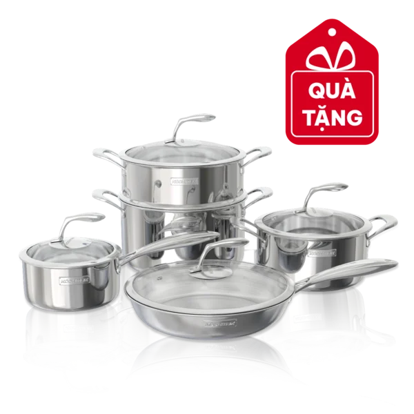 Tất cả được chế tác từ inox SUS304 cao cấp, đáy liền 3 lớp giúp dẫn nhiệt nhanh – tiết kiệm điện – an toàn tuyệt đối cho sức khỏe, tương thích hoàn hảo với mọi loại bếp từ.