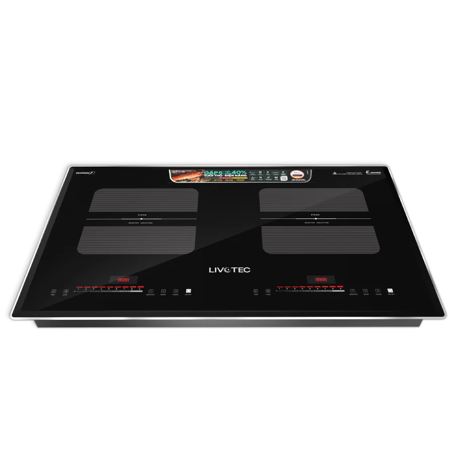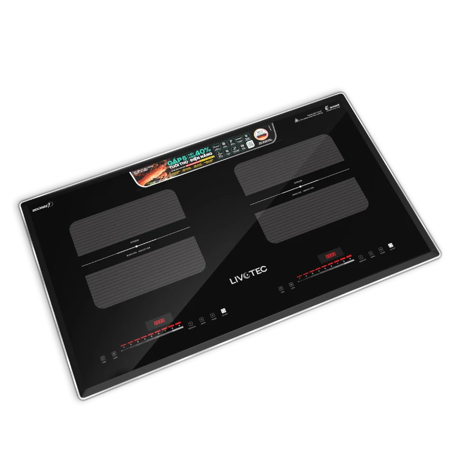 Bếp từ đôi Livotec E-Smart LID-999M nổi bật với công nghệ Smart Inverter tiêu chuẩn Đức, giúp tiết kiệm đến 40% điện năng so với bếp thường.