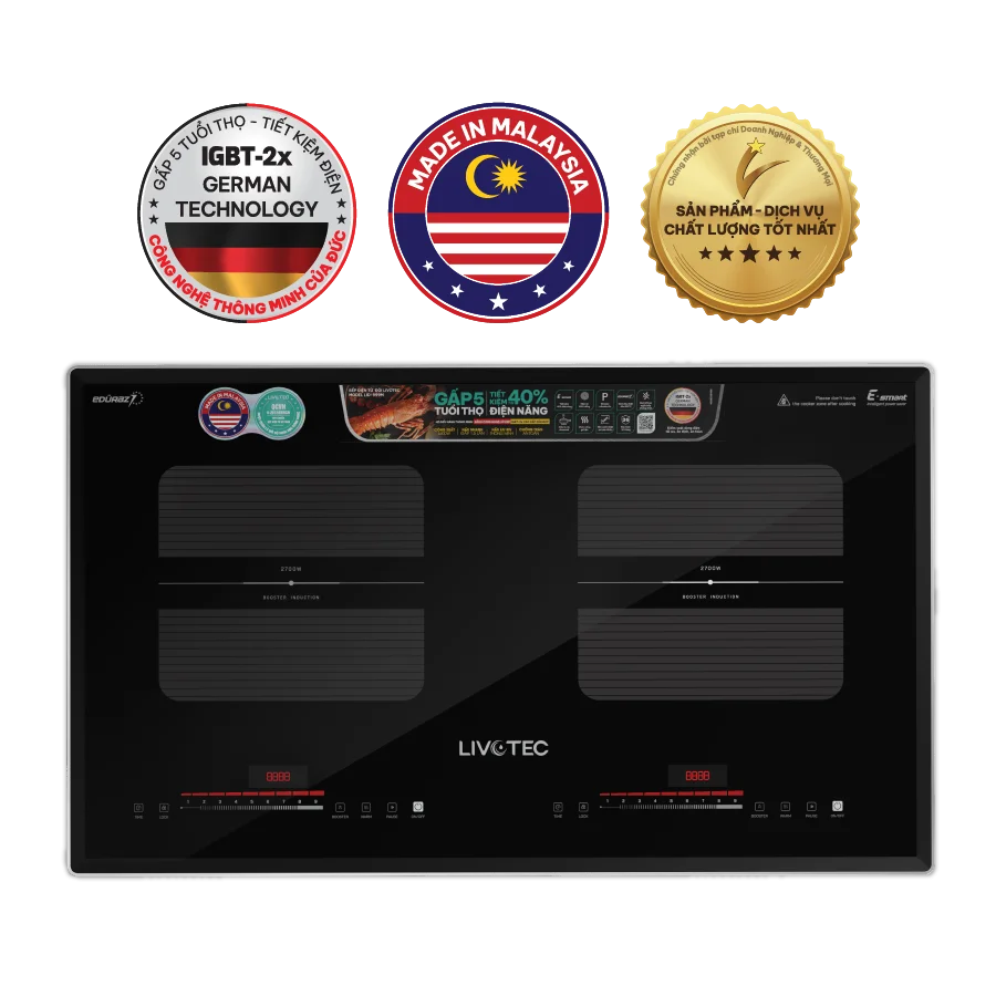 Bếp từ đôi Livotec E-Smart LID-999M được sản xuất tại Malaysia, theo tiêu chuẩn công nghệ Đức (IGBT Infineon).