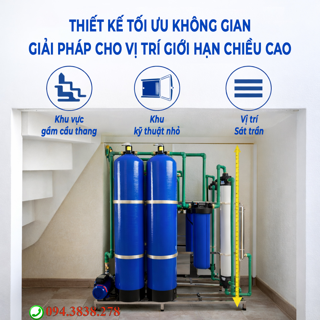 Mẫu lọc tổng màng UF được thiết kế đặc biệt cho những khu vực có hạn chế về chiều cao lắp đặt như gầm cầu thang, khu kỹ thuật nhỏ hoặc vị trí sát trần.