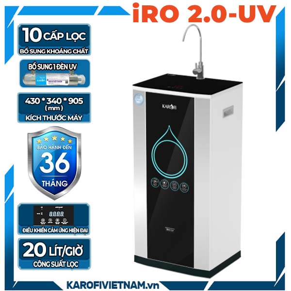 - Máy lọc nước iRO 2.0 tích hợp bộ vi điều khiển có khả năng tự động sục rửa màng RO và khả năng hoạt động cả khi nước cấp yếu.